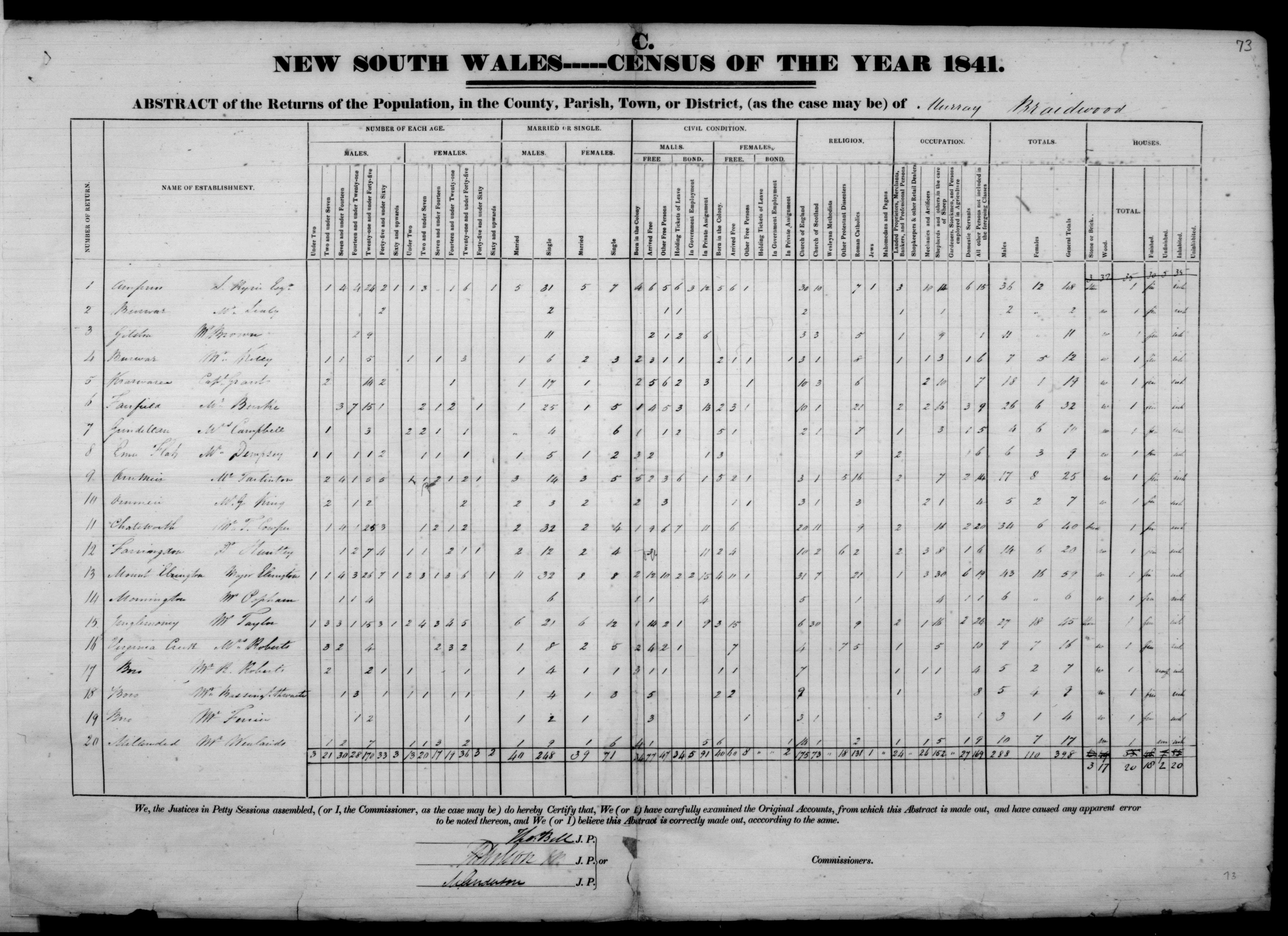 The 'Act for ascertaining the Number of the Inhabitants of the Colony of New South Wales in the Year One thousand eight hundred and forty-one' (4 Victoria No. 26) required every householder, employer of servants and proprietor and occupier of land to complete the census schedule on the second day ('or on the days immediately subsequent thereto') of March 1841. The 1841 census records the population by police districts, counties and towns. The tabulation of results was more scientific. Age groups were adopted, note made of conjugal condition (married or unmarried) as well as civil condition - noting the number of bond (convict) or free males and females in the household and showing whether they were born in the colony, arrived free, held a ticket of leave, were in government employment or private assignment) - and religious denomination.