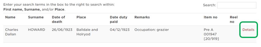 Click on the Details link of an index entry to buy a copy or pre-order the original file for your visit to the Reading Room.