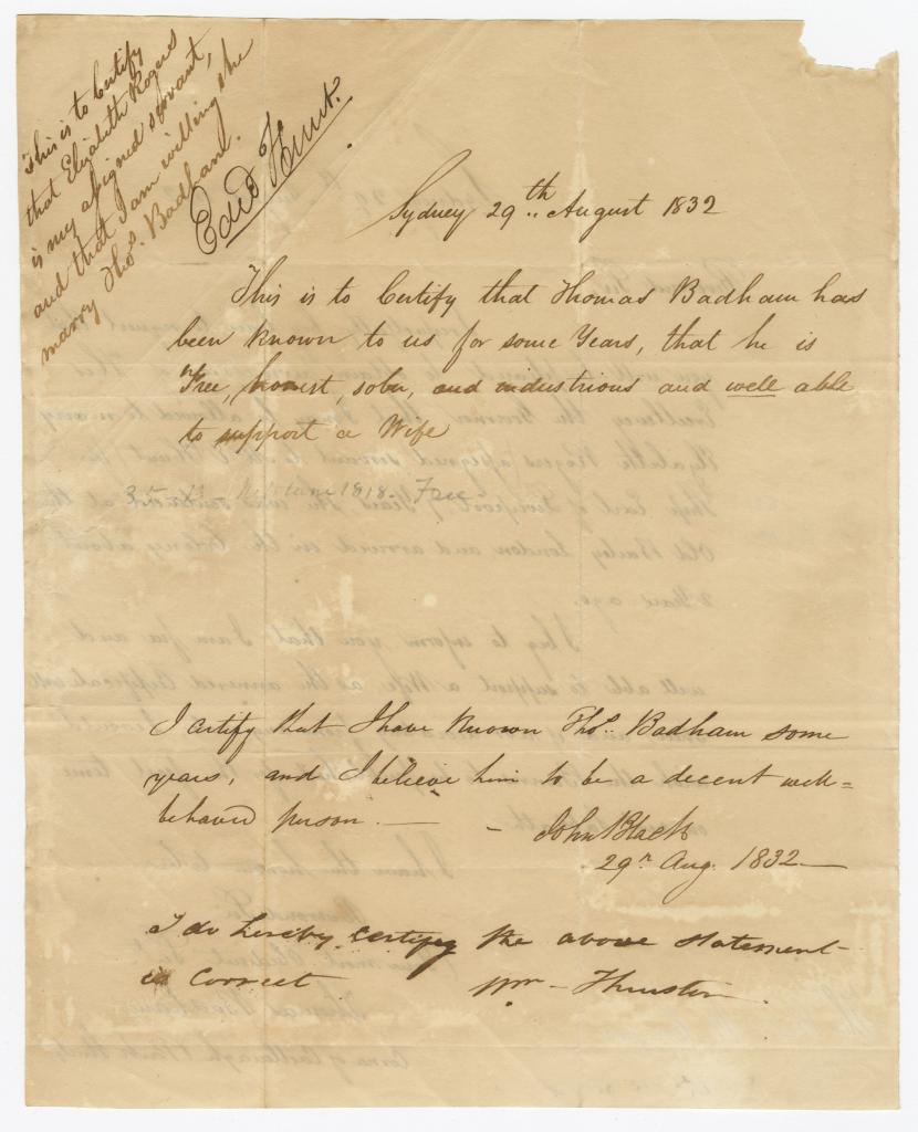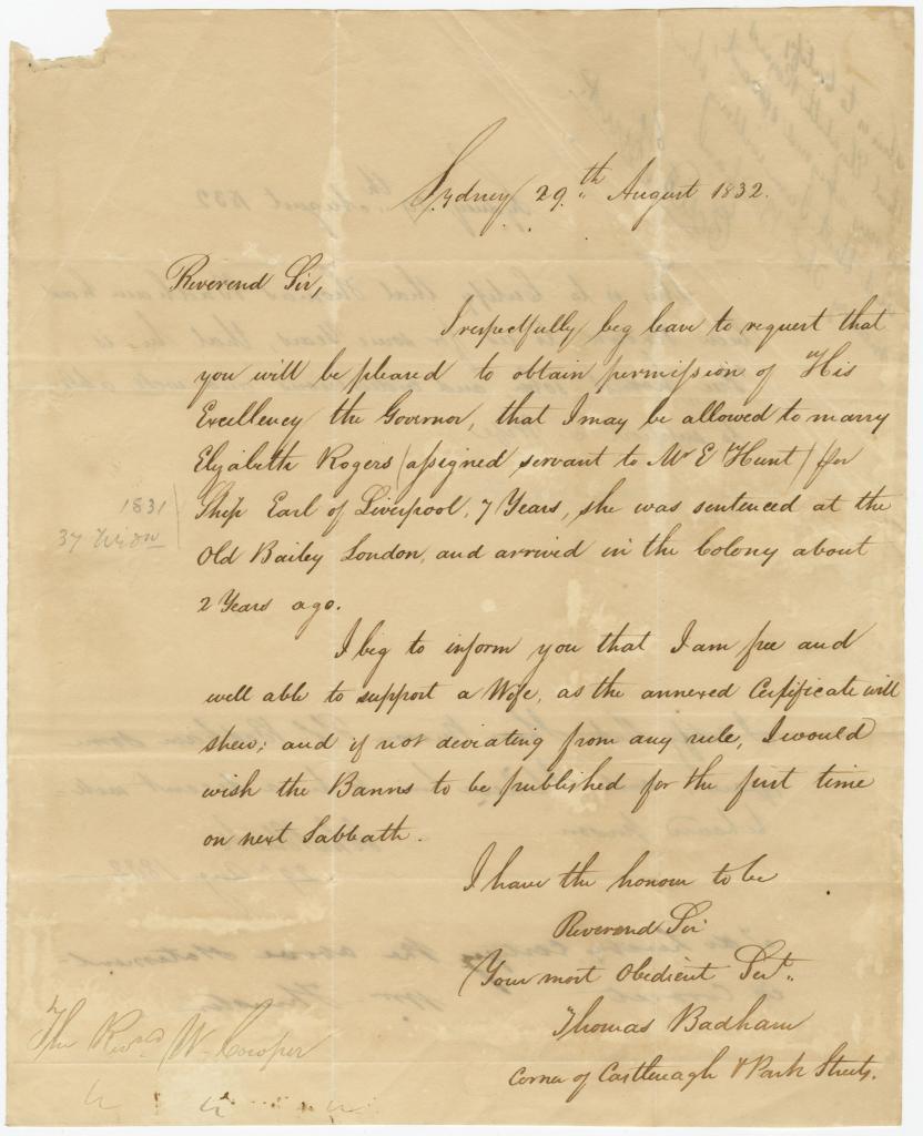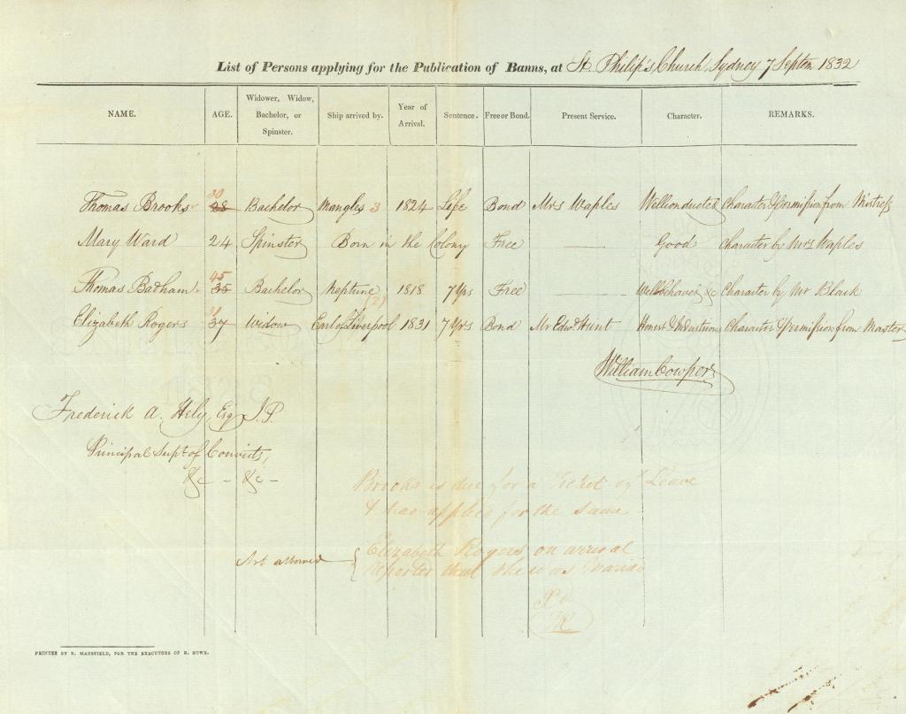 Two couples, Thomas Brooks/Mary Ward, and Thomas Badham/Elizabeth Rogers, expected to have their unions publicised through marriage banns at St Philip’s, Sydney, in September 1832. Each of the four had been given good character references and clergyman, William Cowper, had granted approval.