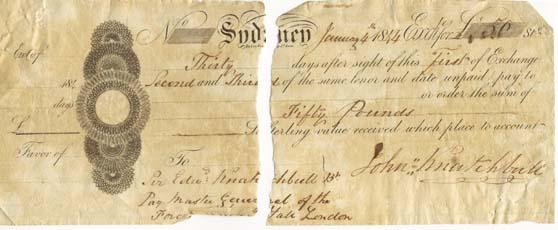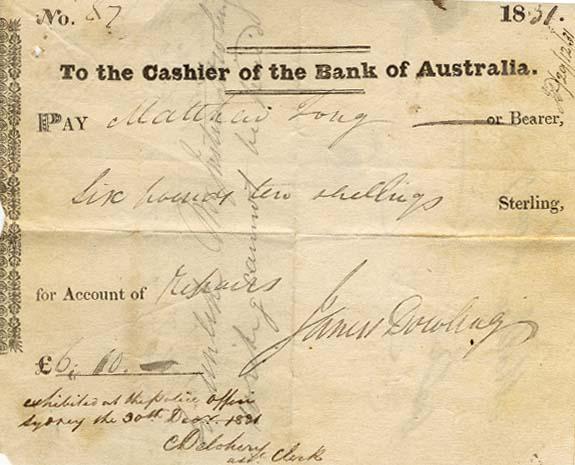 In June 1830 Knatchbull was before the Supreme Court on a charge of forgery. He is listed in the case papers as a labourer and late of Parramatta. Knatchbull was found not guilty. In February 1832 Knatchbull was before the Supreme Court again where he pleaded not guilty to "false making forging and counterfeiting a certain order for payment of money", in the name of Judge James Dowling. The forged note appears here as an exhibit for the prosecution. Knatchbull was found guilty and given a death sentence, which was later commuted to seven years penal sentence to be served on Norfolk Island. Supreme Court: Exhibit of a forgery by John Knatchbull, 1832 [T33 32/55]
