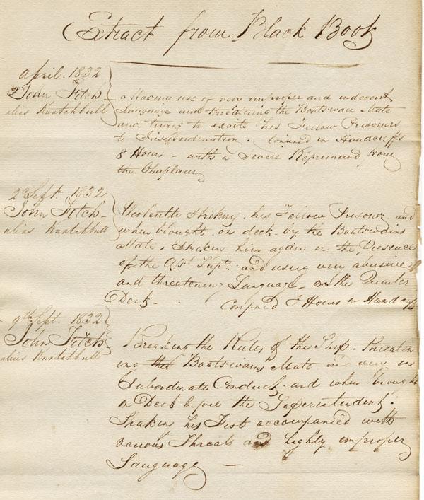 It appears Knatchbull was held on the Phoenix Hulk during 1832 following his conviction for forgery. These entries demonstrate some of the "bad" behaviour of Knatchbull. He was transported to Norfolk Island late in 1832 on the Governor Phillip. While being held on Norfolk Island Knatchbull participated in a convict mutiny but escaped punishment as turned infomer on his fellow mutineers. Knatchbull served out his time on Norfolk before returning to NSW to continue his original fourteen years sentence. He lived in Port Macquarie for a period before retunring to Sydney by July 1843.
