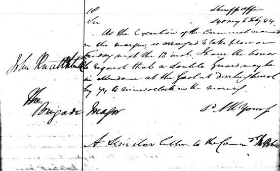 In this letter, the Sheriff's Office, which was in charge of executions, requests from the Colonial Secretary more armed guards to be present at the hanging of John Knatchbull. Knatchbull has the dubious honour of being the first man hanged in the newly opened Darlinghurst Prison, in what was to become one of the last public executions in NSW. Sheriff's Department: Letter dated 6 February 1844 relating to John Katchbull and extra guards for his execution.