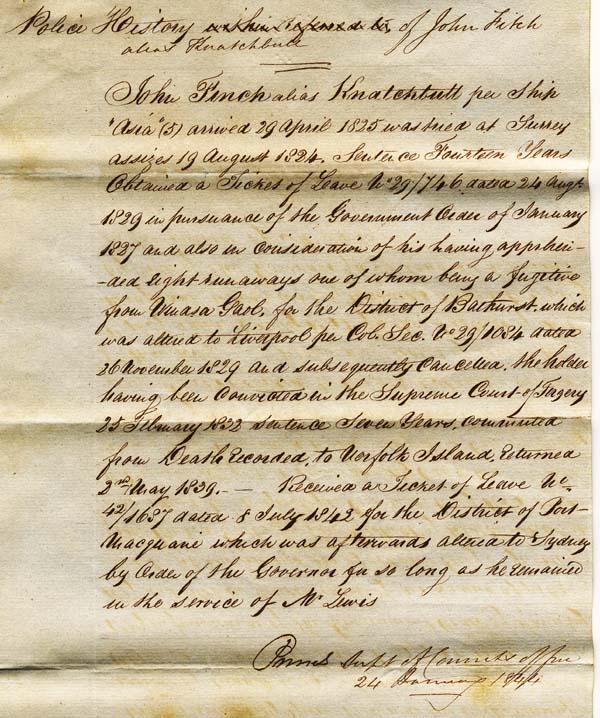 The surviving records of Knatchbull's Supreme Court murder trial in 1844 include a copy of this police report detailing the many aspects of Knatchbull's convict life in NSW.