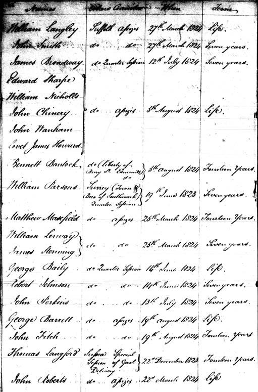 John Knatchbull used the alias of John Fitch throughout his life in England and NSW. This entry from the Ship's Muster for the Asia V reveals the following details: Knatchbull was tried at the Surrey Assizes on 19 August 1824, found guilty and was transported for 14 years. On his arrival in the Colony in April 1825, Knatchbull was sent to Bathurst.