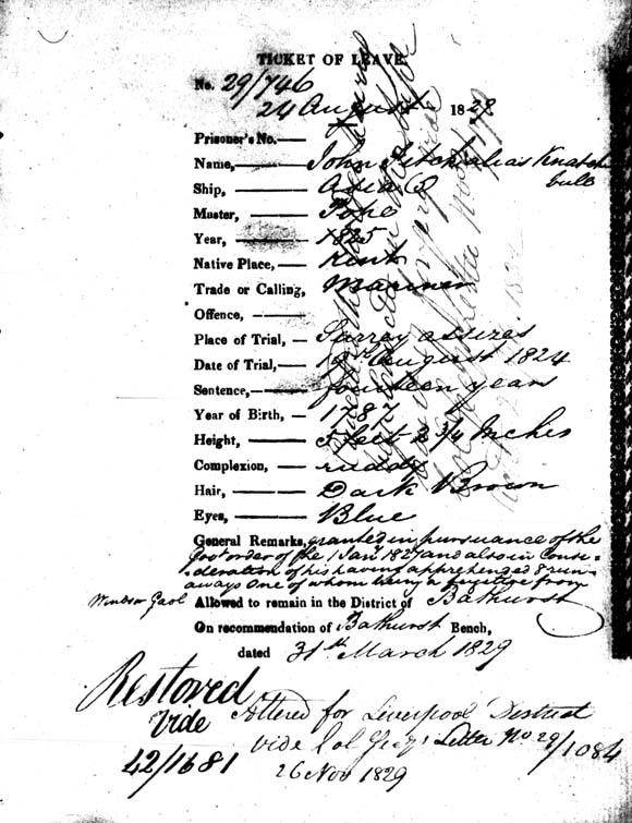 The first Ticket of Leave granted to John Knatchbull was in August 1829 while he was working in the Bathurst region. Knatchbull was granted the ticket for having apprehended eight runaways from Windsor Gaol. He moved to Liverpool in November 1829 where he became an overseer on the Parramatta Road and the Bathurst based ToL was cancelled. A later ticket from 1842 (42/1681, Reel 912) is also listed for the district of Port Maqcuarie, where Knatchbull was based on his return from Norfolk Island.