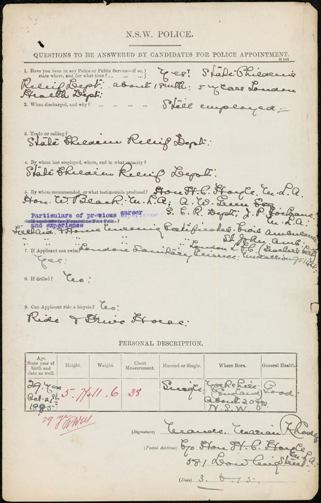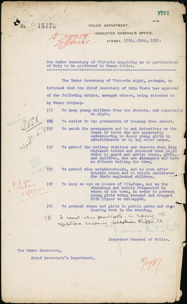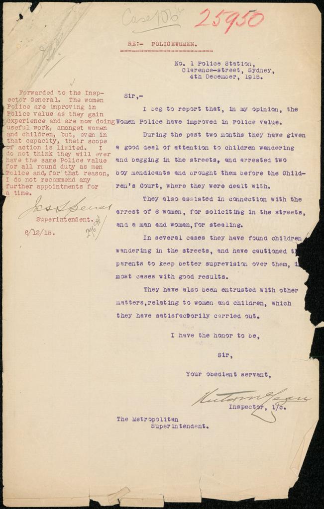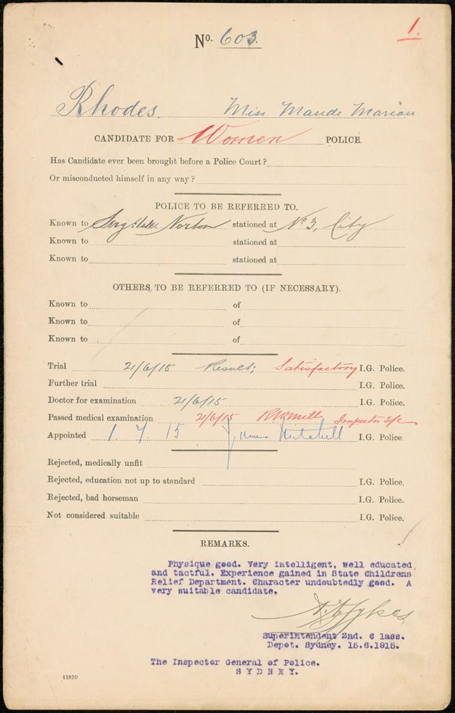 In 1915 the NSW Police Department advertised for two female special constable positions. Around 400 women applied, with the successful applicants being Maude Rhodes (an inspector for the State Children Relief Department) and Lillian Armfield (a nurse at Callan Park Mental Hospital). At the time there were 2,661 police officers in the NSW force. Rhodes and Armfield were not only the first women employed as police officers in NSW, but also the first in Australia.