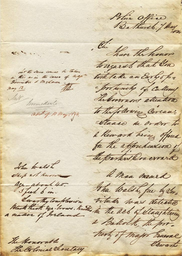 The letter below, from the Bathurst Police Station is dated 10 May 1834. It is a request for a reward to be honoured for the arrest of John Walsh: