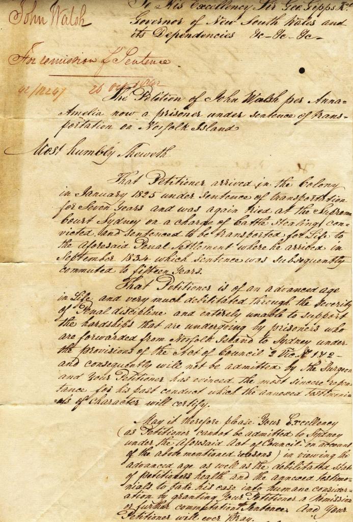 The petition below is from John Walsh to the Governor, Sir George Gipps and relates to the remission of part of his sentence. Walsh's colonial conviction was for life on Norfolk Island but on his arrival in September 1834 the sentence was commuted to 15 years. Following this petition the sentence was reduced by another five years to ten years. Walsh claimed in the second paragraph he was of advanced age (about 50 years old) and