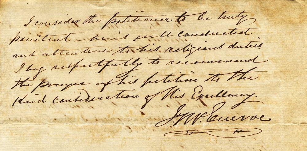 "truly pentient - he is well conducted and attentive to his religious duties."