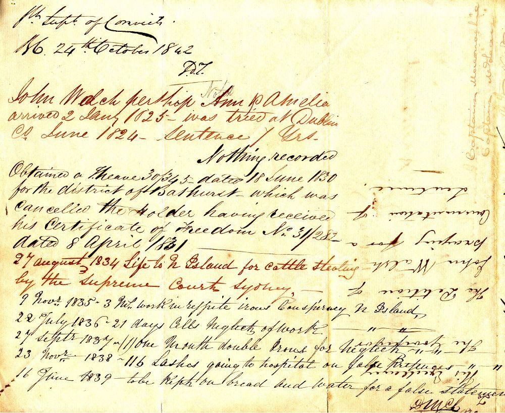 John Walsh was born in County Dublin in 1793 and convicted of cattle stealing in 1823. He received a seven year sentence and was transported to New South Wales on the Ann and Amelia. He received a Ticket of Leave in 1830 (30/345) for the Bathurst region and a Certificate of Freedom in 1831 (31/282).