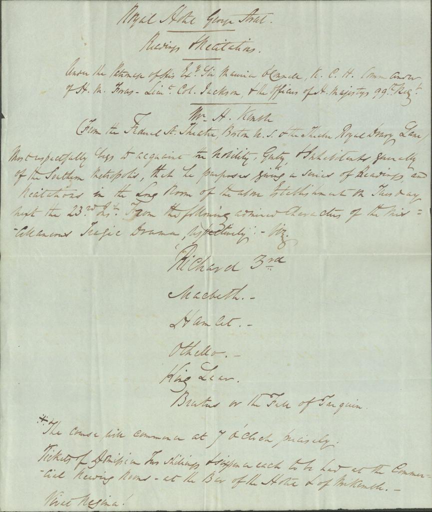 Best known for his solo renditions of Shakespeare plays, Kemble’s performances were often received with laughter and, occasionally, with riotous behavior. Among the Colonial Secretary's papers is correspondence from Kemble including his applications for dramatic licences. On some of these he has appended his seal which features an image of William Shakespeare.