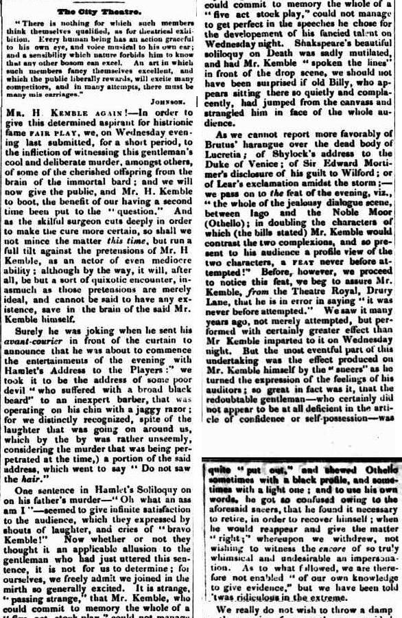 ‘One sentence in Hamlet’s Soliloquy on his father’s murder – “Oh what an ass am I” - seemed to give infinite satisfaction to the audience, which they expressed by shouts of laughter and cries of “bravo Kemble!”