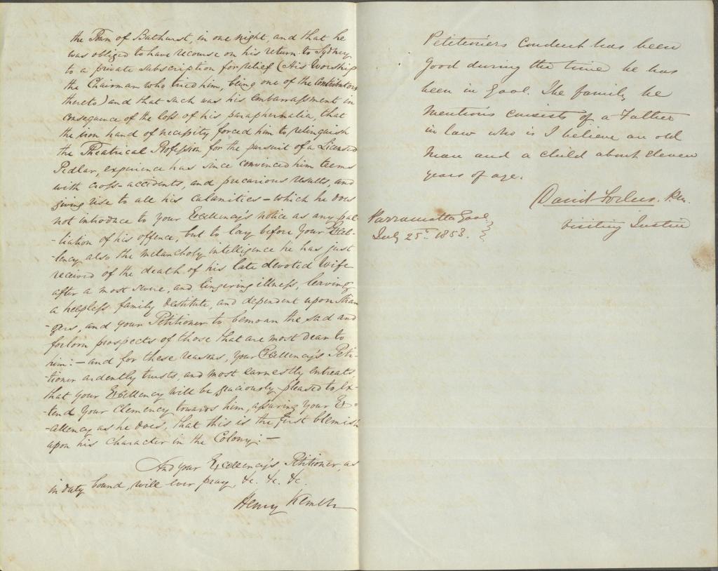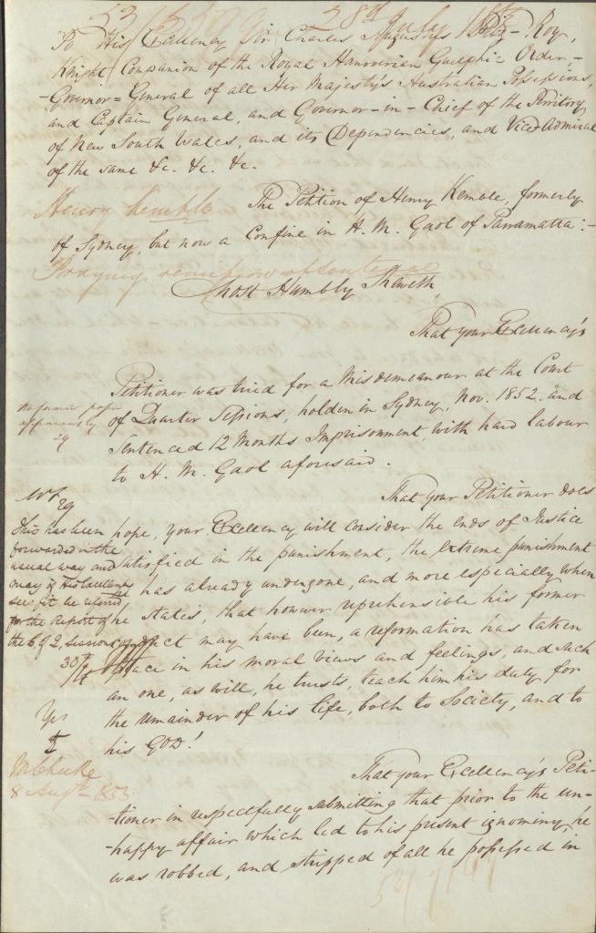 In 1853, Kemble petitioned the Colonial Secretary from Parramatta Gaol pleading for early release offering us a glimpse into his personal circumstances. He submits that