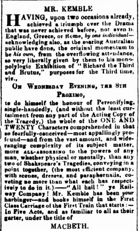 Henry Kemble was a most unusual actor. He was a monopolylogist – he played all characters within the plays he performed, as this advertisement from Trove demonstrates.