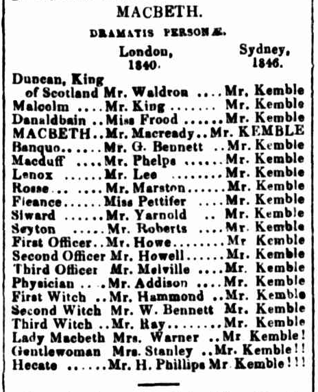 His first performance was in the Royal City Theatre in March 1846 and was a monopolylogue of Richard III in which he played all the characters himself. The performance was panned in a review by Bell’s Life of Sydney magazine who observed