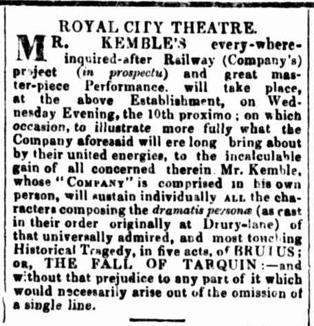 Mr Kemble, whose "Company" is comprised in his own person, will sustain individually ALL the characters...