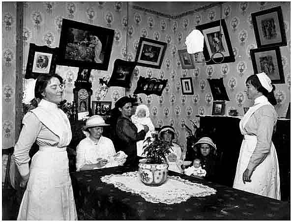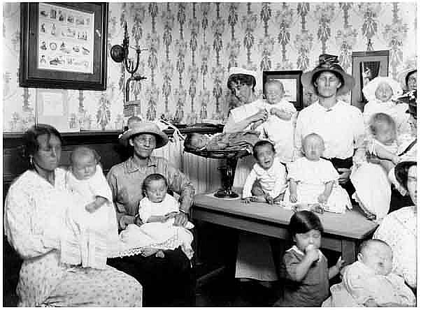 This photographic series consists of modern reproductions of photographs thought to have been taken in 1914 when the first baby clinics were opened. The black and white photographs were possibly taken or commissioned by the Department of Public Health and may have formed part of a larger project of photographing health services to children as contemporary photographs exist for other health services.