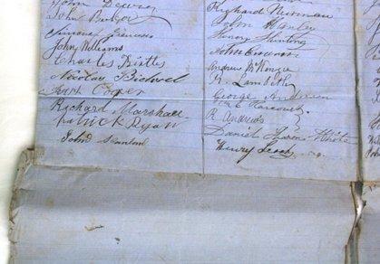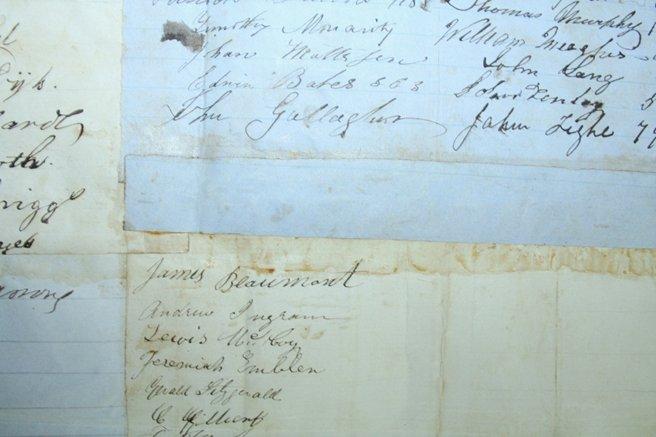 Because the petition is made up of sheets of paper of varying sizes, getting it all to fit had inherent problems. Slightly larger sheets would be loose and liable to crease when they were stuck to a smaller sheet, whereas the smaller sheet would potentially tear. Also, some of the signatures were pasted underneath corresponding sheets.