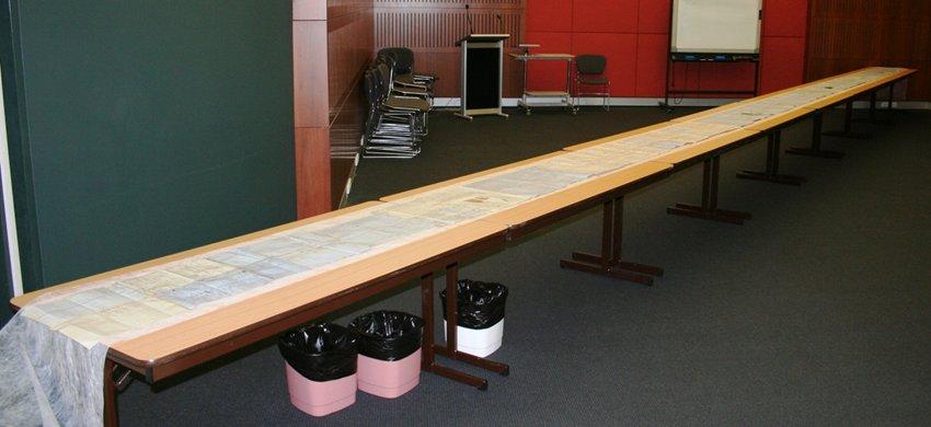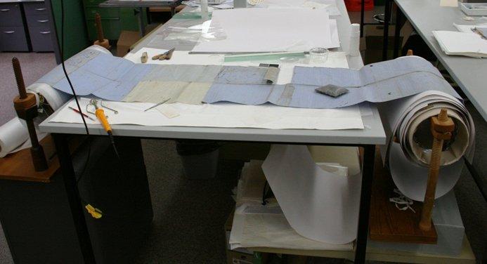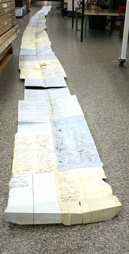 The petition was unrolled along a cleared corridor and then three conservators carefully unfolded it. It was then rolled back onto a large cardboard cylinder, where it could be un-wound a little at a time for repair.
