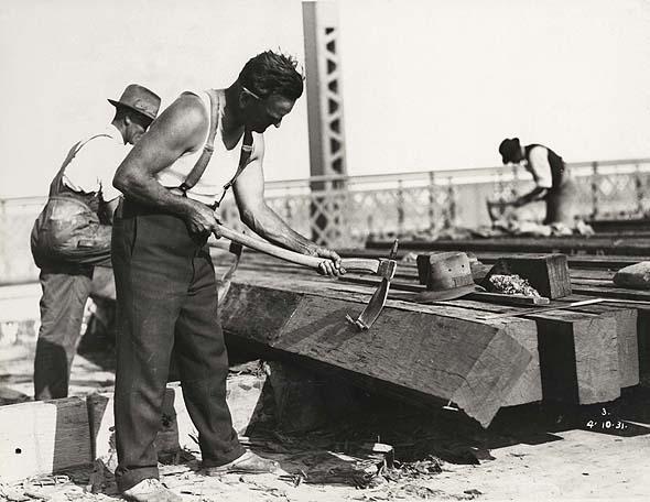 There are many photographs of equipment both idle and in use. Examples of these include cranes of various sizes; plate mangle; hydraulic riveter; angle cropper; drilling machines; creeper crane; power pumps; hydraulic jacks and the painting gantry. Some of the components were prepared off-site and there are photographs of these in construction and of their delivery to the bridge. The granite slabs were quarried in Moruya NSW and the quarrying, cutting and finishing of the blocks are shown together with a number of photographs of the town.