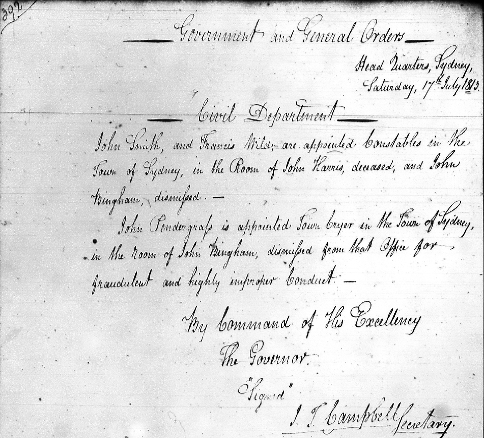 “… John Pendergrass is appointed Town Cryer in the Town of Sydney, in the Room of John Bingham, dismissed from that Office for fraudulent and highly improper conduct.”