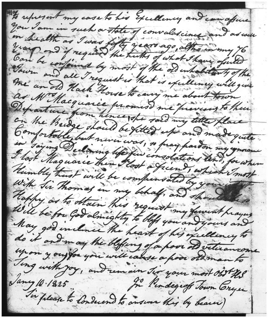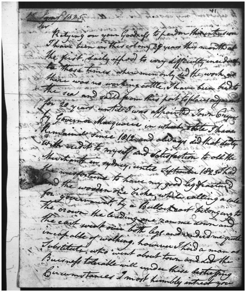 “…September 1823 I had The misfortune to have my good leg fractur’d And the wooden one broke, while calling a sale For government, by a Bullock cart belonging to The crown the leading one ran me down and the cart went over both legs and rendered me quite Incapable of walking…all I request is that is excellency will give me an old Hack Horse to carry me about town As Mrs Macquarie promised me previous to their Departure from hence she said my little Place On the Bridge should be fitted up and made quite Comfortable…May god incline the heart of his excellency to do it and may the blessing of a poor old veteran come upon your for you will cause a poor old man to Sing with joy...”