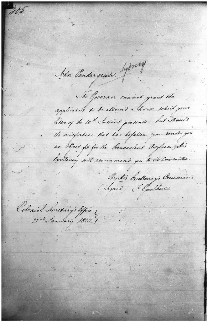 “…The Governor cannot grant the Application to be allowed a horse which your Letter of the 10th Instant presents : but should The misfortune that has befallen you render you An Object fit for the Benevolent Asylum, His Excellency will recommend you to its Committee.“