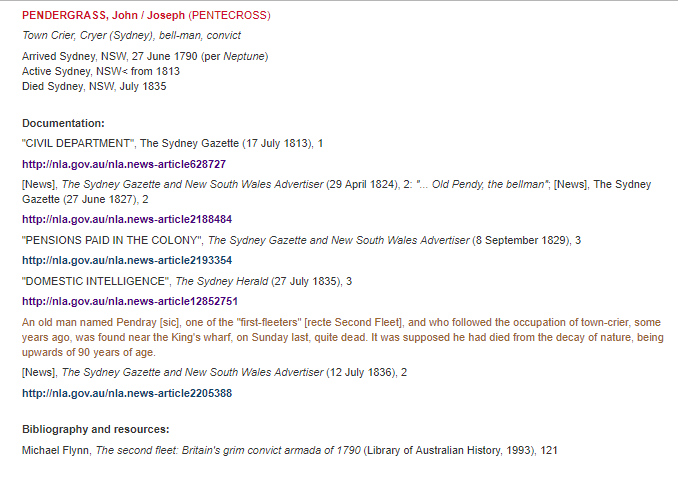 An internet search for John Pendergrass found entries in Trove and a listing for him on the AustralHarmony (University of Sydney) website, confirming his occupation and name of Pentecross. The entry includes links to Trove and the The Second Fleet, Britain’s Grim Convict Armada of 1790 by Michael Flynn as a source of information. The AustralHarmony website is "An online resource toward the history of music in colonial and early Federation Australia".