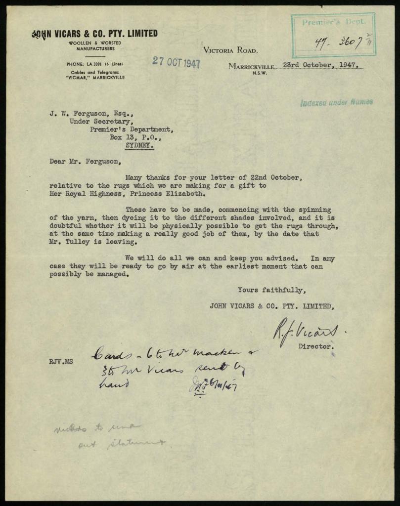 The government also intended to send three rugs to the Princess. John Vickers & Co, Woollen & Worsted Manufacturers of Marrickville, had been engaged for this task. They too were subject to the same tight deadline of just over two weeks manufacture time. On 23rd October R. J. Vickers, Director, wrote to Under Secretary Ferguson noting his reservations regarding the timeline.