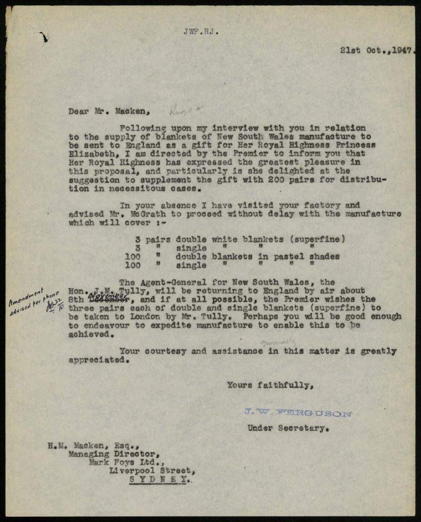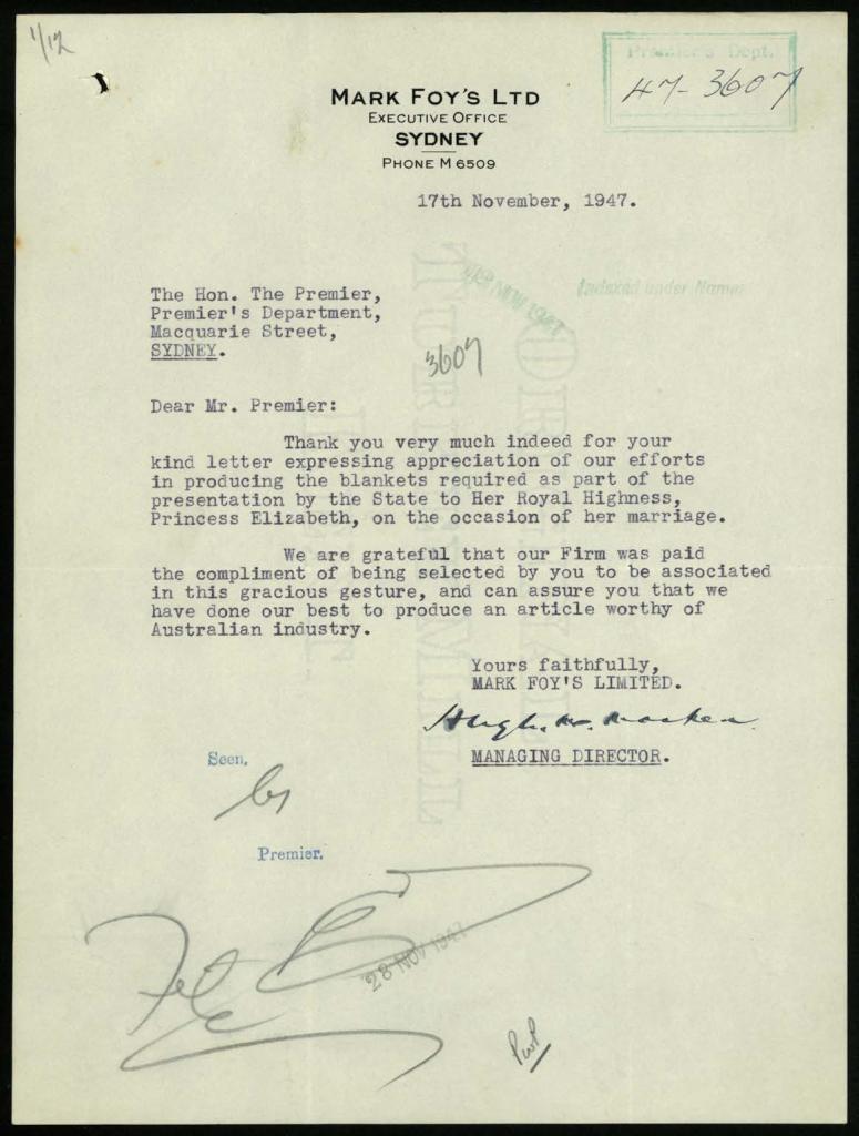 With the wedding fast approaching, there was little time to spare. Under Secretary Ferguson had met with H.M. Macken, Managing Director of Mark Foys (one of Australia’s foremost department stores) and by 21st October Ferguson advised Macken that he had ‘visited your factory and advised Mr McGrath to proceed without delay with the manufacture’ of both the blankets for the Princess and the 200 pairs for distribution. Given the Agent-General for NSW was returning to England by air around 8th November, and the Premier wished that the Princess’s gift travel with him, Ferguson asked Macken if ‘you will be good enough to endeavour to expedite manufacture to enable this to be achieved.’