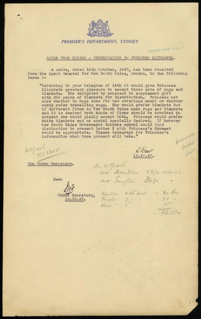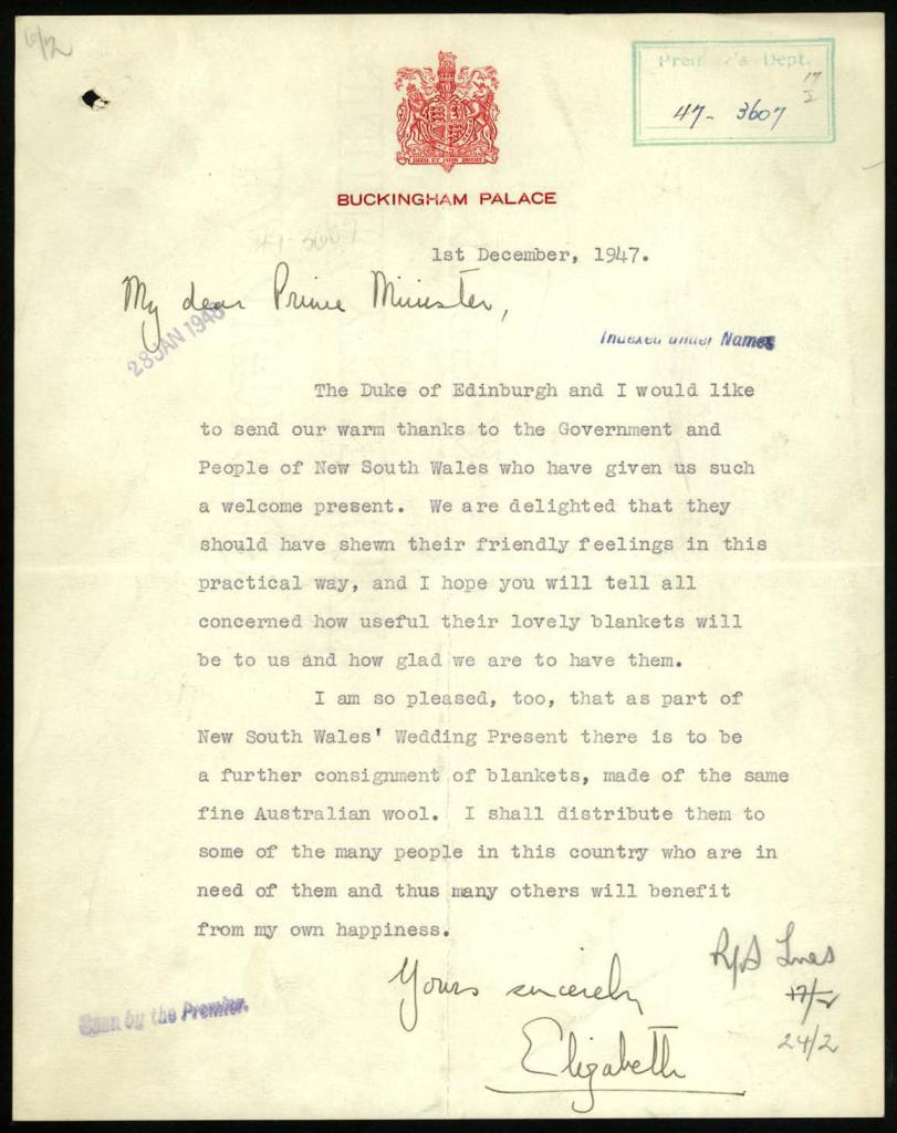 Amongst the Premier’s correspondence is a letter from Princess Elizabeth thanking the ‘Government and People of New South Wales’ for the wedding gift. Elizabeth and the Duke were ‘delighted that they [NSW] should have shewn their friendly feelings in this practical way, and I hope you will tell all concerned how useful their lovely blankets will be to us and how glad we are to have them’. The letter further notes the Princess’s pleasure at the additional consignment of blankets intended for distribution. ‘I shall distribute them to some of the many people in this country who are in need of them and thus many others will benefit from my own happiness’.