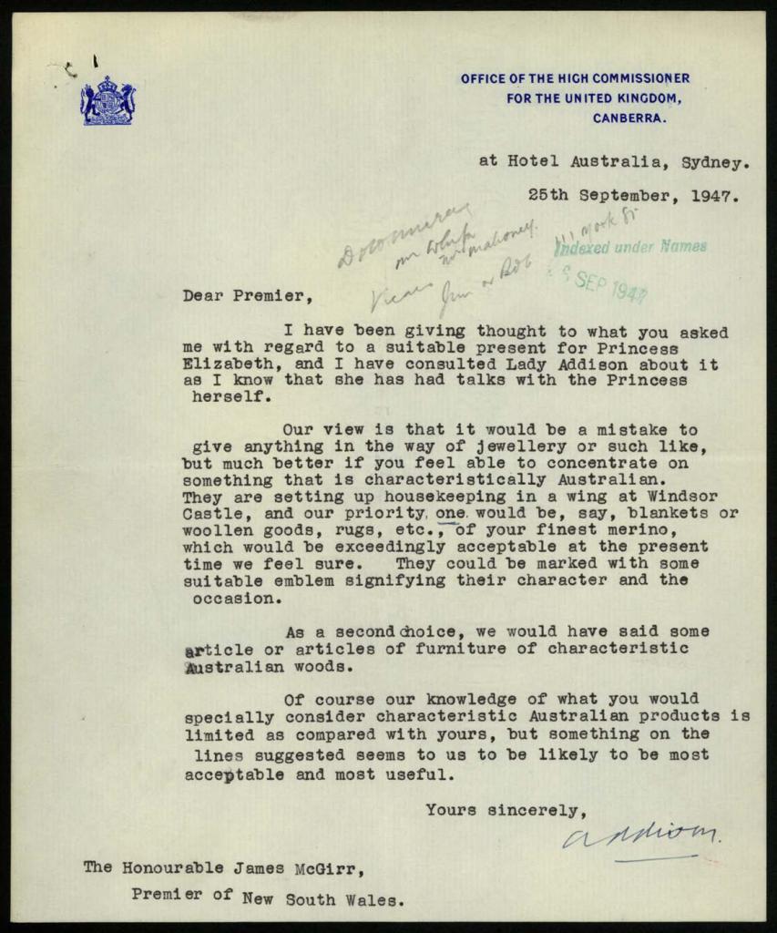 Our view is that it would be a mistake to give anything in the way of jewellery or such like, but much better if you feel able to concentrate on something that is characteristically Australian. They are setting up housekeeping in a wing at Windsor Castle, and our priority one would be, say blankets or woollen goods, rugs etc., of your finest merino, which would be exceedingly acceptable at the present time we feel sure…