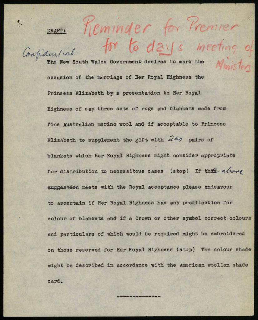 The New South Wales Government desires to mark the occasion of the marriage of Her Royal Highness the Princess Elizabeth by a presentation to Her Royal Highness of say three sets of rugs and blankets made from fine Australian merino wool and if acceptable to Princess Elizabeth to supplement the gift with 200 pairs of blankets which Her Royal Highness might consider appropriate for distribution to necessitous cases.
