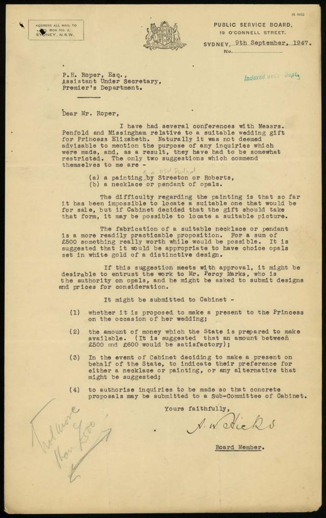 In mid September 1947, Under Secretary Joshua William Ferguson sent the Premier’s Department a Minute titled ‘Wedding Gift for Princess Elizabeth’. In the document he outlines the ‘small committee’ he has arranged ‘to make discreet inquiries (without disclosing the purpose), regarding an appropriate gift which the Government of the State might desire to make to Princess Elizabeth’. The committee, consisting of Mr A.W. Hicks, Member of the Public Service Board, Mr A.R. Penfold, Curator of the Technological Museum, and Mr Hal Missingham, Director of the National Art Gallery made the following suggestions: