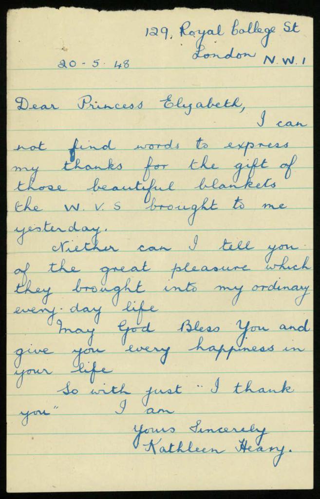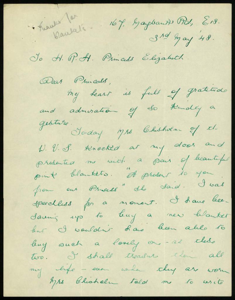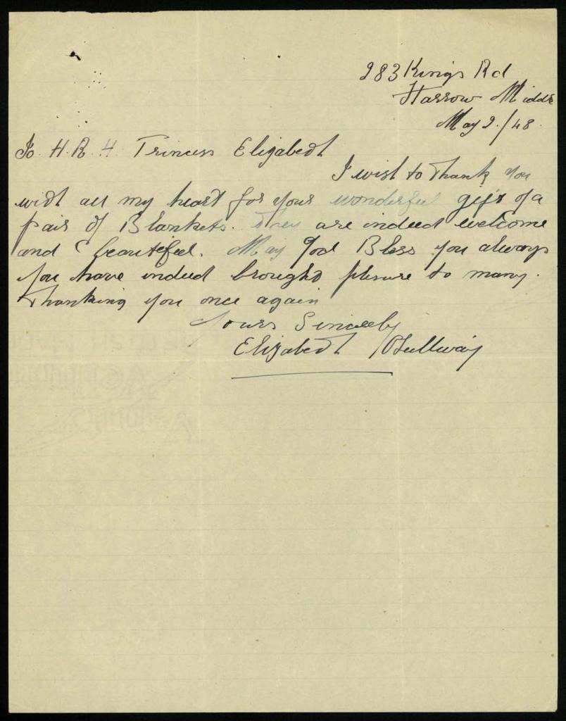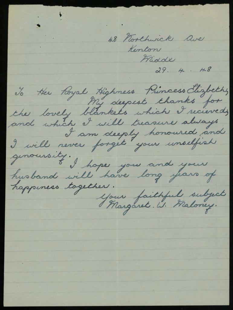 Princess Elizabeth thought that the People of New South Wales who so kindly sent Her Royal Highness some blankets as a Wedding Present, for the Princess to give to people in this Country, might be interested to see the enclosed samples of the many letters of thanks which Her Royal Highness has received. There can be no doubt that these blankets have given immense pleasure to those who were lucky enough to receive them.