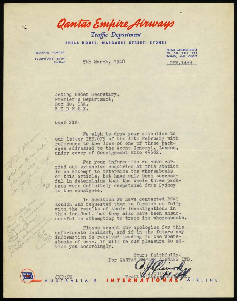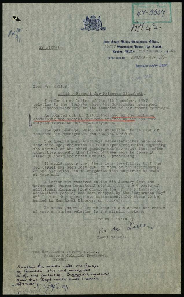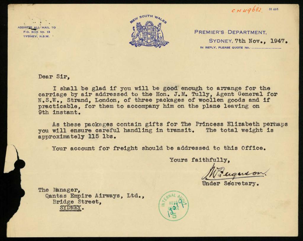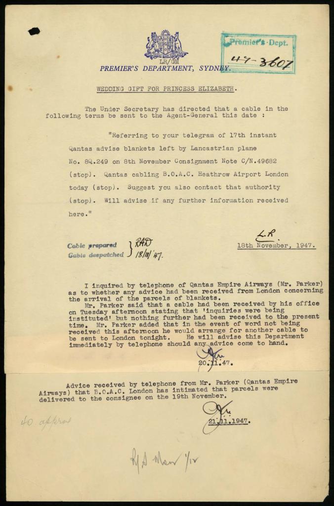 The Under Secretary was quick to act upon the shocking news that Princess Elizabeth’s present appeared to be missing. Following the arrival of the alarming cable, the Under Secretary contacted the Qantas Empire Airways Freight Department to determine what had gone awry. He was informed that ‘the three parcels of blankets addressed to the Agent-General, London, left Sydney by the Lancaster plane at 9.30pm on Saturday, 8th November’. He was further informed ‘that it would be most unusual procedure if parcels were taken off a Lancaster’ en route. Confirmation of despatch was cabled to the Agent General. The urgency of the matter was clear as cables and telephone calls went back and forth between the Under Secretary, the Agent General and Mr Parker of Qantas: