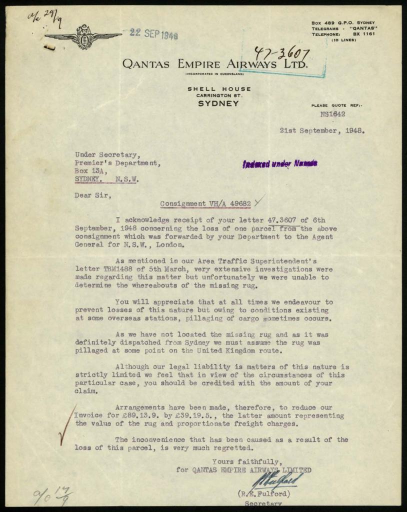 Updates from Qantas in March 1948 indicated that despite ‘extensive enquiries’ they have ‘been unsuccessful in attempting to trace its whereabouts’. The third package was lost. Enquiries made to the Agent General determined that the rugs produced by John Vicars & Co were the missing items. Qantas was called upon to adjust their invoice given the loss and while this duly occurred, they noted that ‘as we have not located the missing rug and as it was definitely dispatched from Sydney we must assume the rug was pillaged at some point on the United Kingdom route’.