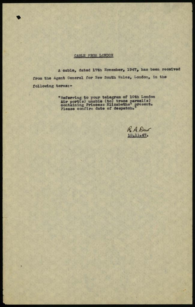 Airmail dated 5th December 1947 and received 17th of that month brought some good news for the Premier and his team. The Agent General wrote that on receipt of the telegram confirming despatch, ‘immediate enquiries were made of the Air Line authorities and after some trouble two of the packages containing the Government’s wedding presents to Princess Elizabeth were located and delivered at this Office’.