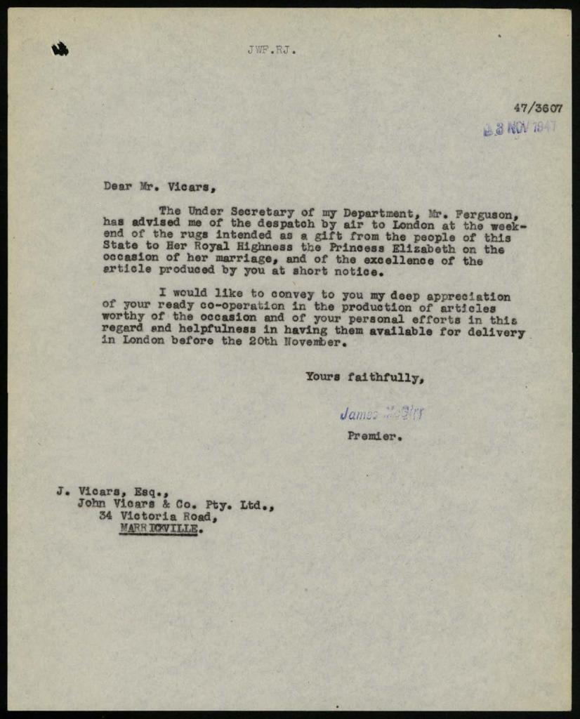 Despite Vickers’ reservations, the rugs were manufactured on time. Both Vickers and Macken received thanks from Premier McGirr: