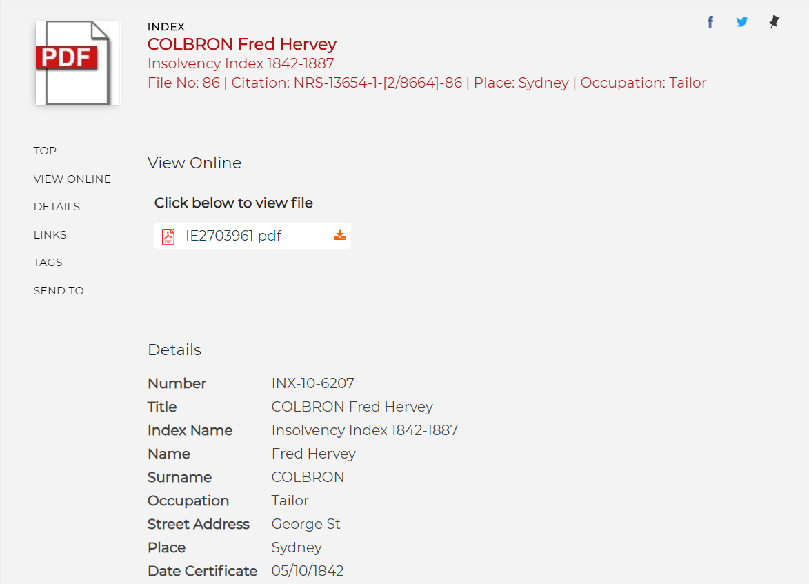 Use the Insolvency Index to find Insolvency files. Type the name of the person you are searching for. You can also search by occupation or locality. Click on the Details link at the end of the entry. This will take you to the full entry in our catalogue, Collection Search. A PDF download icon will indicate if the file is digitally available. You can also find files by searching the catalogue - simply type the word “Insolvency” and the name you are searching for, e.g. “Insolvency Fred Colbron”.