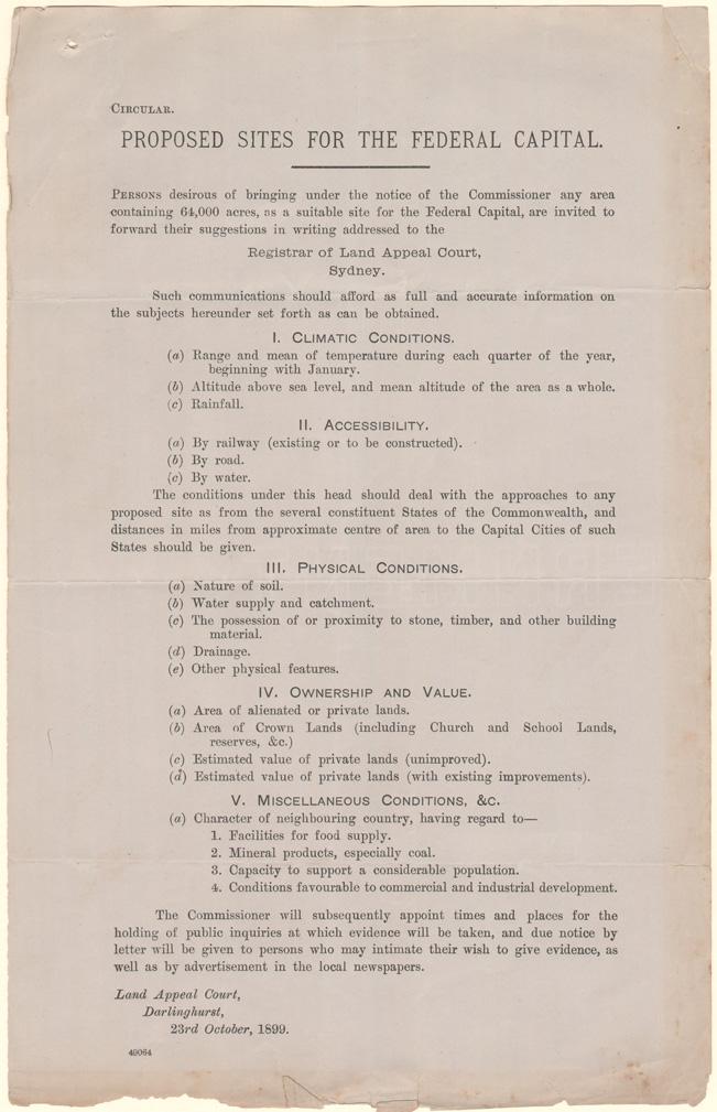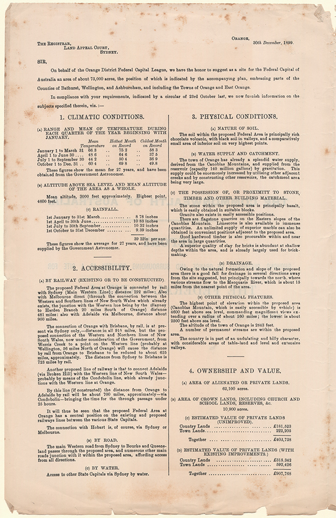 Forty towns vied for the honour of being named Australia’s capital city [1]. We hold these submissions as part of the records of the Royal Commission on sites for the Seat of Government of the Commonwealth. The submissions contain personal statements from prominent citizens addressing the selection criteria, maps of the proposed site and statistical tables relating to climate, water supply, food production and mineral resources.