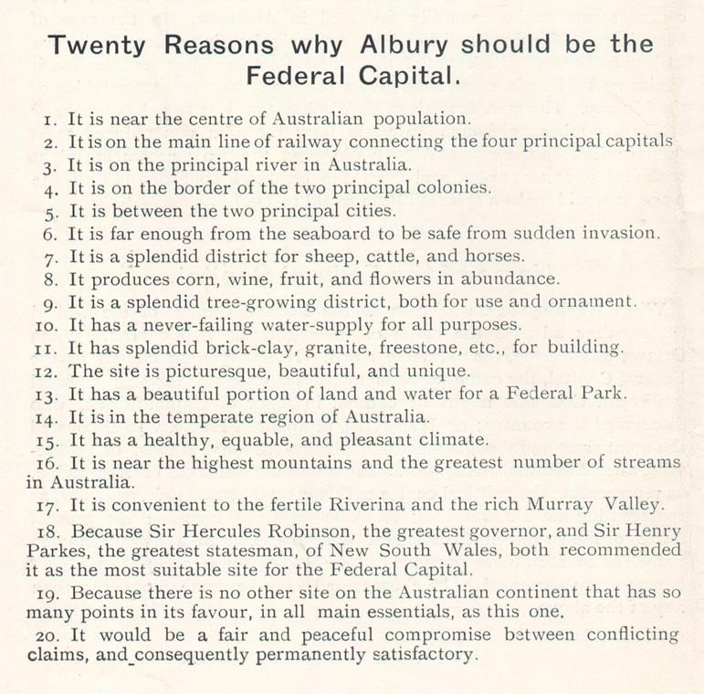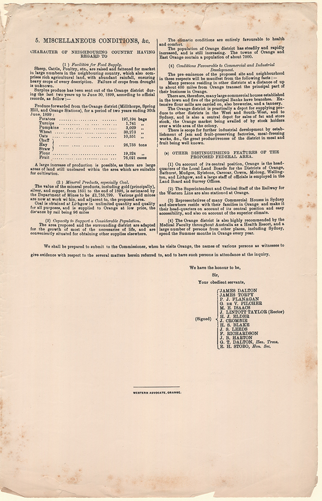 Whilst all of these submissions lost out to Canberra they are in effect a time capsule for rural New South Wales c.1900 and a valuable resource for social, local and family historians. On the broadest level they provide an insight into the prerequisites for the growth and sustenance of a successful city at the dawn of the 20th century. Many issues such as transport, health, climate, water and mineral supplies remain very high on today’s national agenda. At a local level they provide an interesting insight into each area, its prominent citizens, outstanding attributes, facilities and resources.