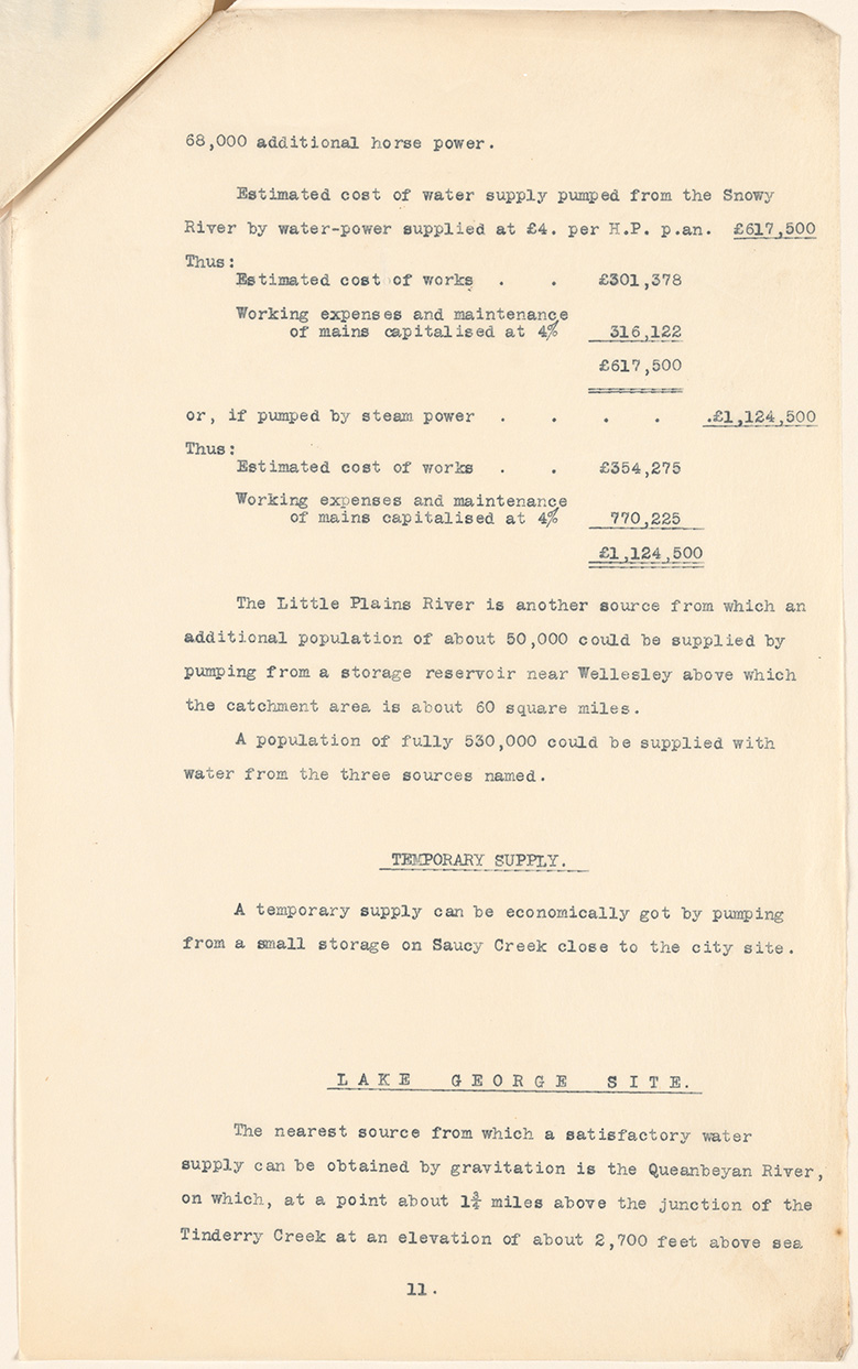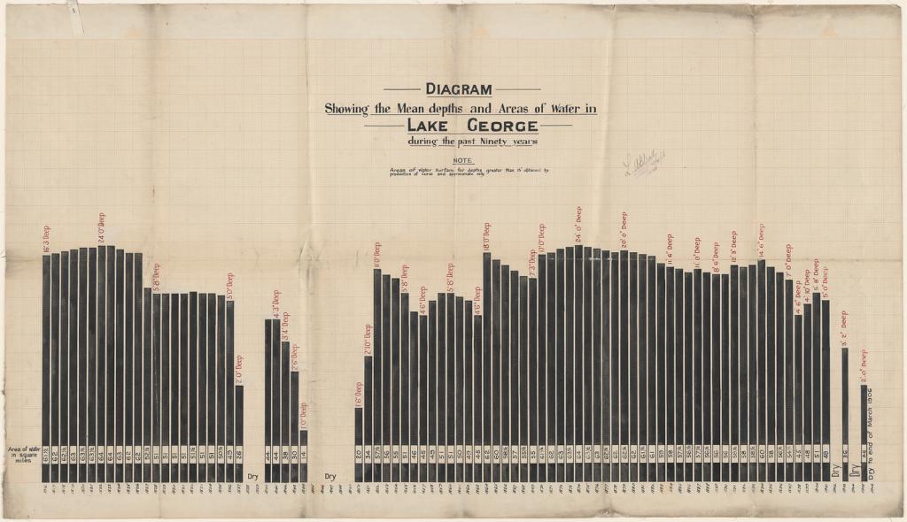 Of all the information submitted regarding climate, rainfall and water supply the absolute standout has to be the giant black and white hand drawn table of the Lake George water levels covering almost a century. There is also a detailed report regarding the practicalities of water supply from this area that also highlights the complexity and importance of this particular issue.