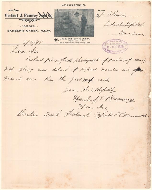 It is also a rarity in that Rumsey, officially the Hon. Secretary of the Barbers Creek Federal Capital Committee, does not appear to hold a recognisable position of authority or status. By far the majority of submissions have relied on statements from doctors, lord mayors, graziers, architects, solicitors, parliamentarians as well the government astronomers and surveyors.