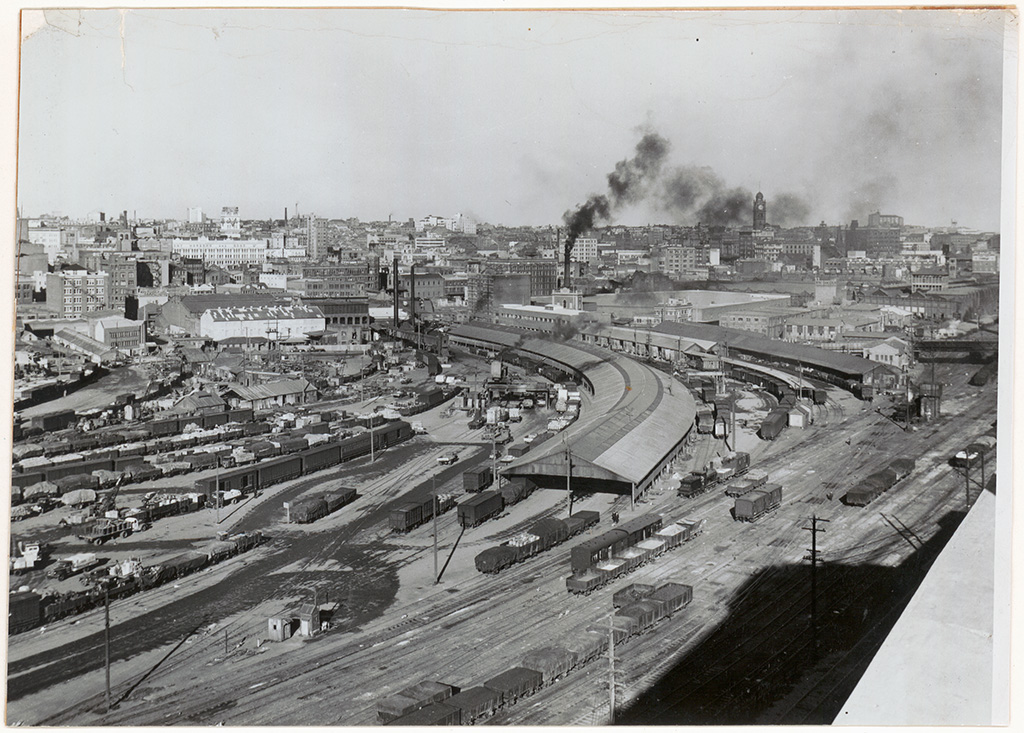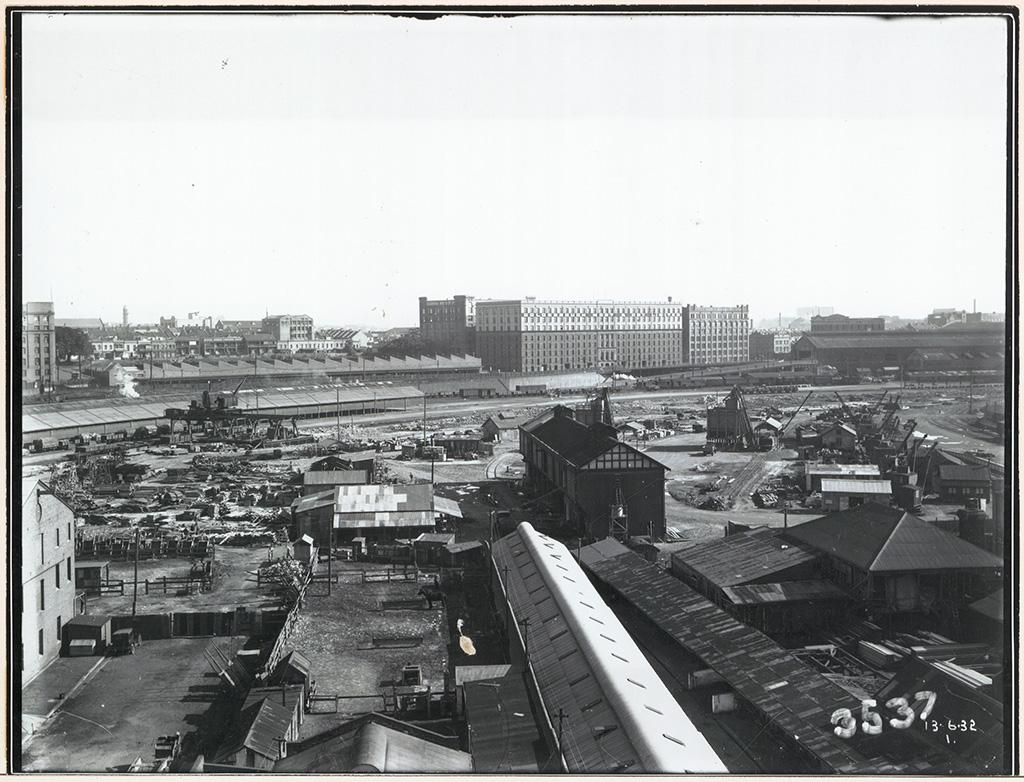 When the first railway opened in Sydney in 1855 it included a single line to Darling Harbour. The railway yard was situated at the Ultimo/Pyrmont end of the Harbour. By 1874 the railway goods yard was extended on reclaimed land and by 1891 all outwards goods traffic was being dispatched from Darling Harbour. By the 1960s the Goods Yard encompassed 56 acres (22 hectares), including 50km of track transporting 13,500 trains a year.[4] The last goods train departed Darling Harbour in 1984.