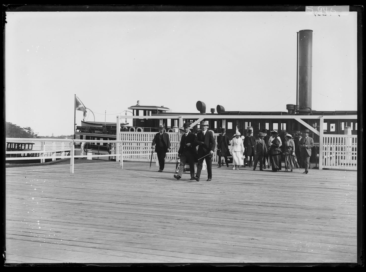 Above: Passengers [opening party including Premier Holman, cane in hand] disembarking at Taronga Park Wharf, October 1916. From NRS 4481, ST4946.