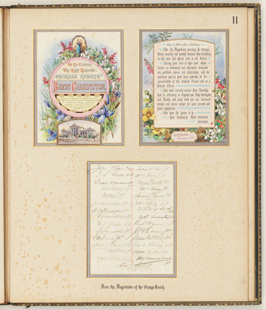 The 13 albums contain illuminated addresses that were presented to Charles Robert Carington* (1843-1928) during his tenure as Governor of New South Wales from 12th December 1885 to 3rd November 1890.
