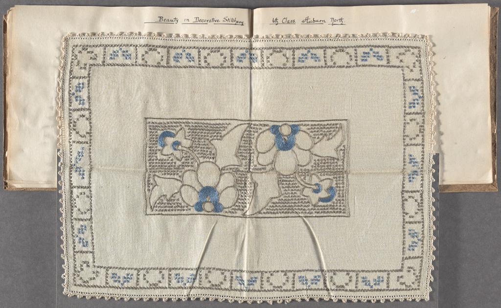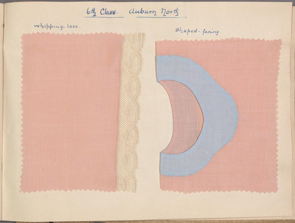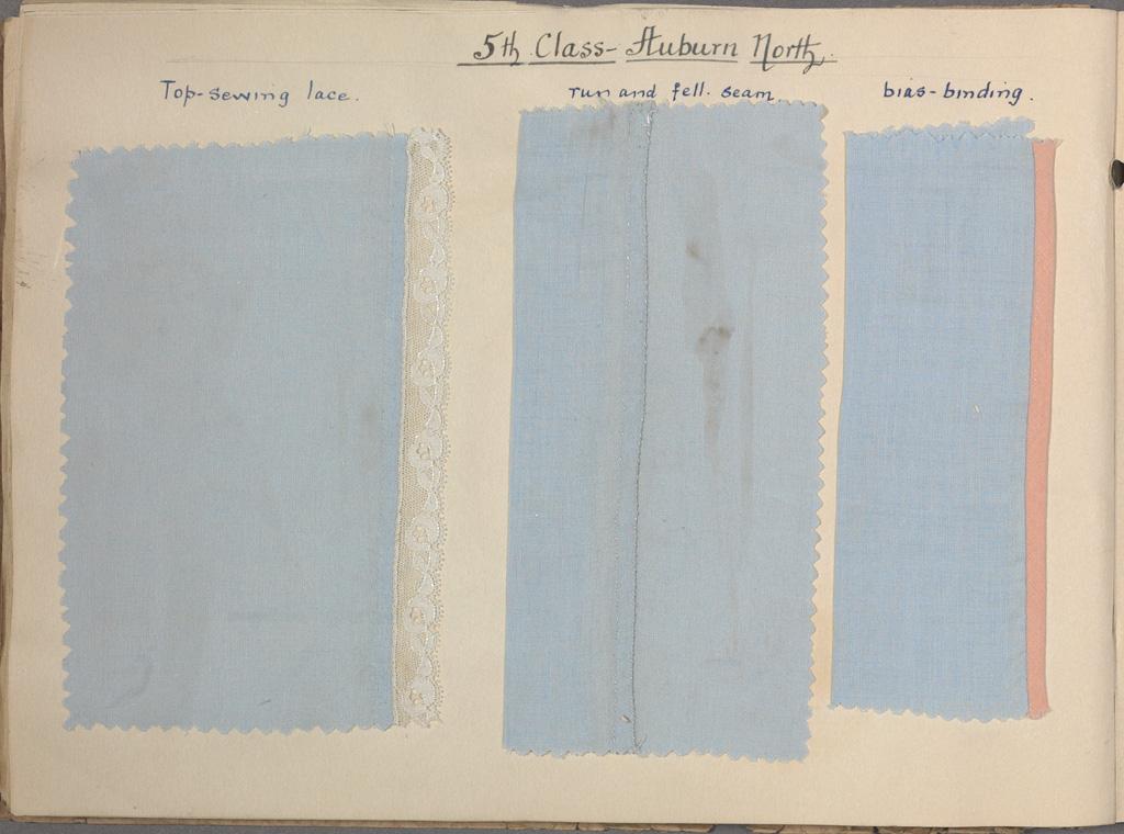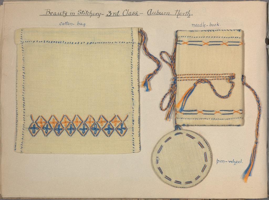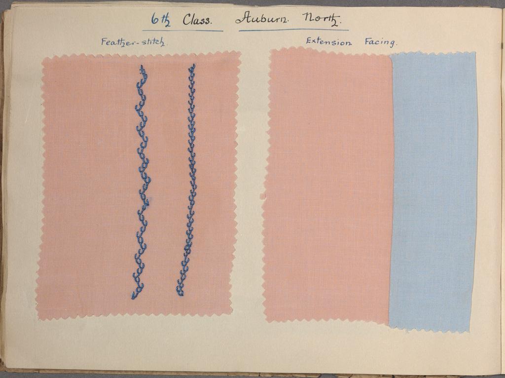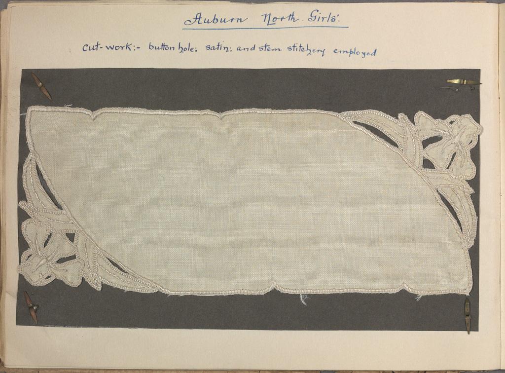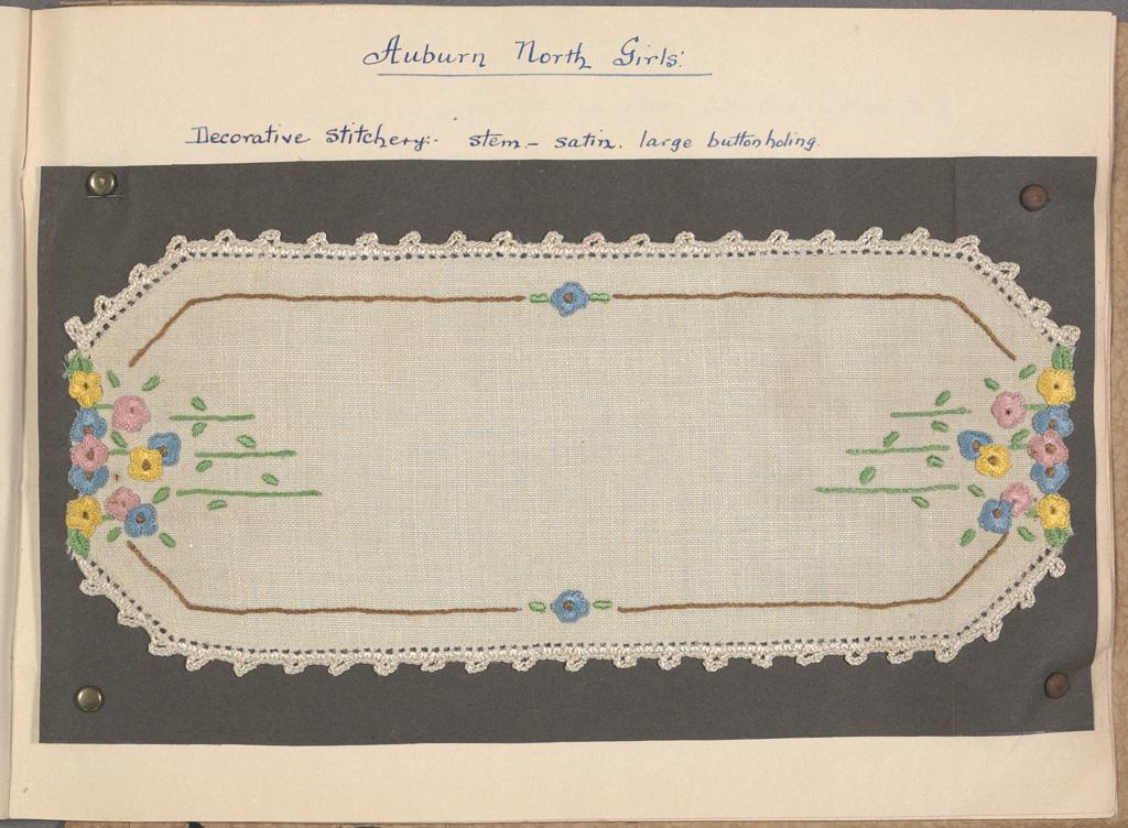 These sewing samples were found in school files and were done by students at Auburn North Girls School in 1939. The samples show several styles of needlework, titles include: decorative stitchery, cut-work, feather stitching and whipping-lace. Needlework was an important component to the school curriculum. This subject was practical not to mention providing many students with hours of entertainment before the days of television and X-box!