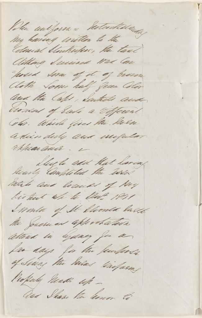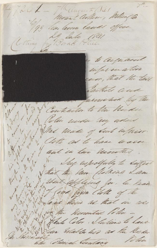 The letter describes the type of material to be used to make the border police uniforms dated 1841. The material is very thick and must have been extremely uncomfortable during the warmer months (perhaps not the most practical option).