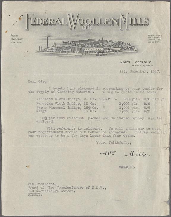 Sample of fabric for Fire Brigade Uniform material, 1949 and 1952 [20/14738-39]. This sample was attached to a letter sent to the Board of Fire Commissioners from Federal Woolen Mills Ltd in Geelong as part of a quotation for the supply of material.